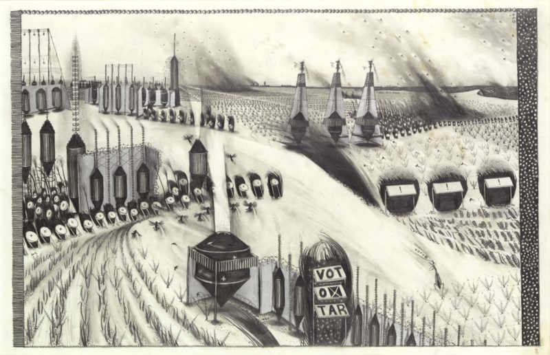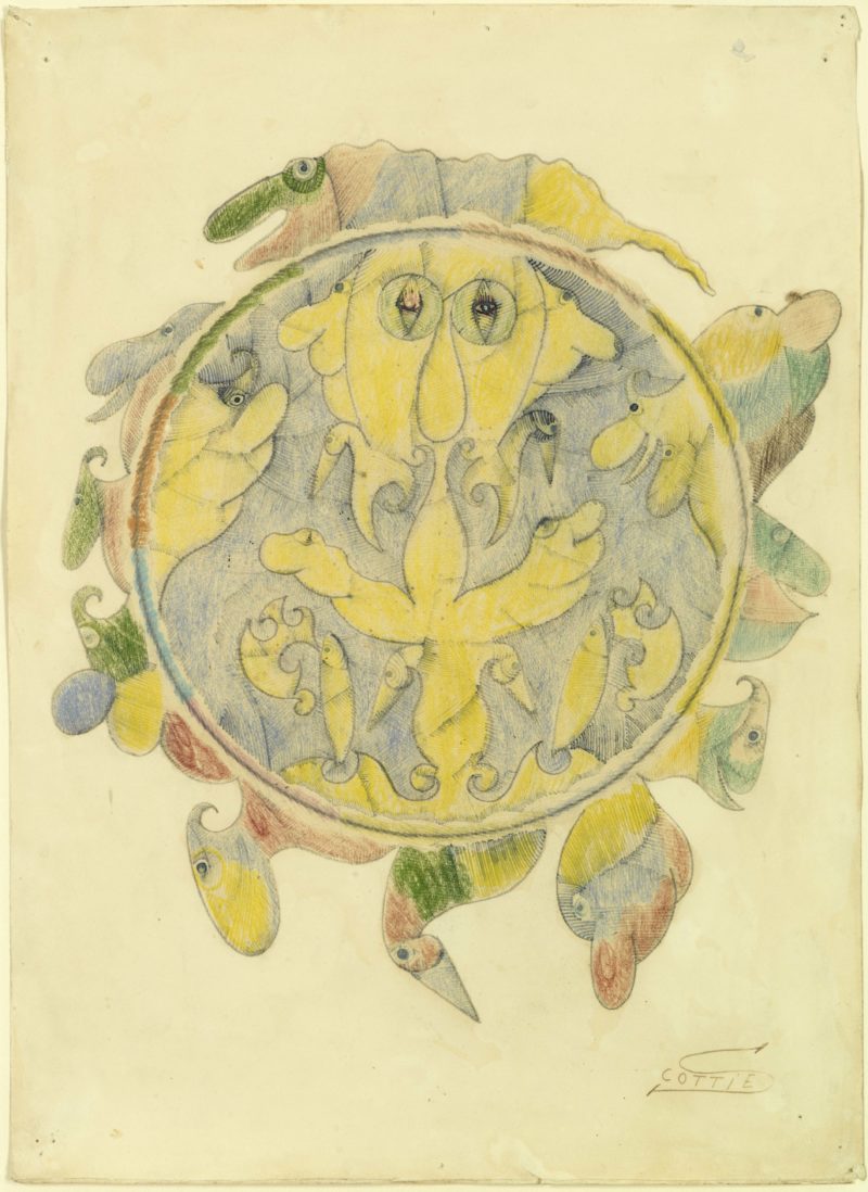 Scottie Wilson • Vase mit Fischen • ca. 1950 • Farbige Tinten auf Papier • signiert • 37 x 25 cm![]() Hipkiss • 469 Votox Tar • 2005 • Mischtechnik auf Papier • signiert • 35 x 54 cm