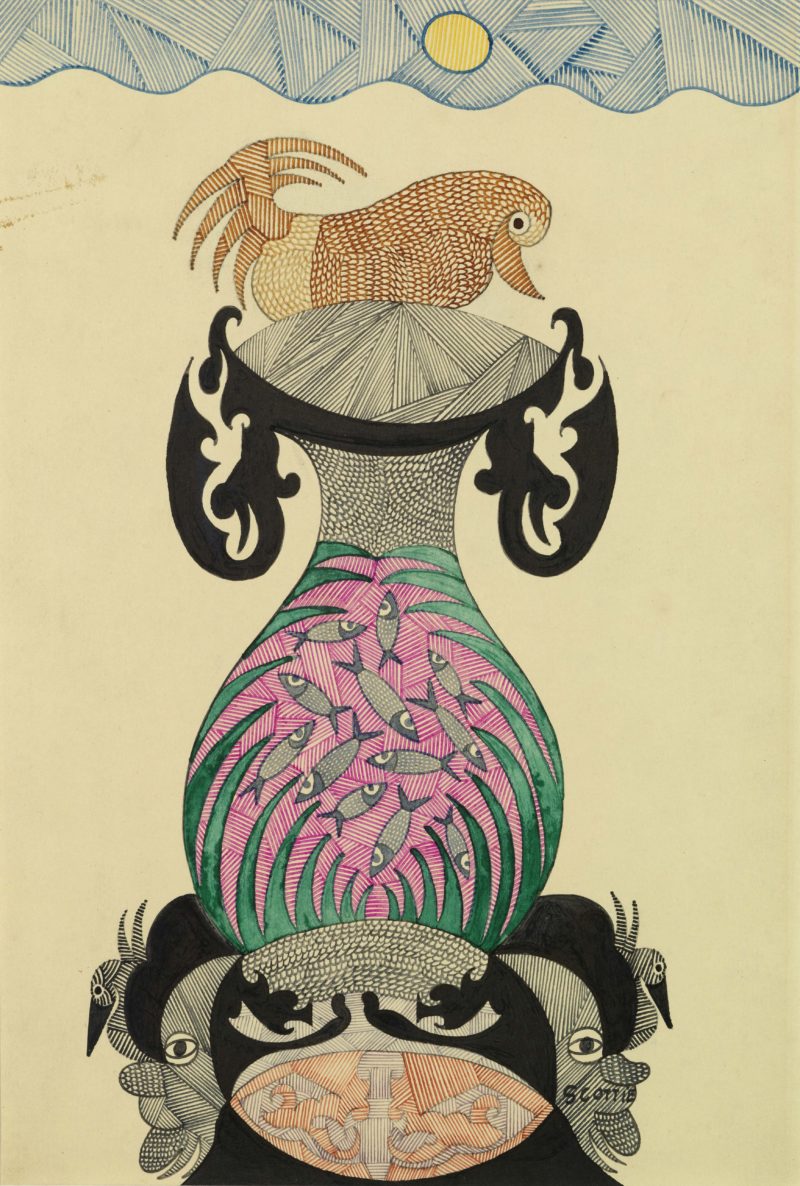 Scottie Wilson • Fish and Birds with Greedy • ca. 1940 • Farbige Tinten auf Papier • signiert • 38 x 28 cm![]() Scottie Wilson • Vase mit Fischen • ca. 1950 • Farbige Tinten auf Papier • signiert • 37 x 25 cm