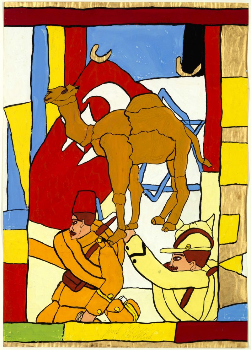 Ernst Ludwig Kirchner • Zwei Akte vor Aktgemälde • 1928 • Kohlezeichnung • Nachlass Stempel • 51,7 x 34,7 cm![]() Josef Wittlich • Zwei Soldaten, Kamel und israelische & türkischer Flagge • ca. 1970 • Gouache auf Papier • signiert • 86 x 63 cm