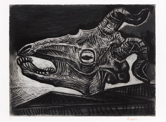 Hervé Bohnert • Engelskopf mit Flügeln • 2015 • Holz • 40 x 33 x 18 cm![]() Pablo Picasso • Le Cráne de Chévre sur Table (Die Ziegenschädel auf dem Tisch) • 1952 • Aquatintaradierung • 51,5 x 66,8 cm